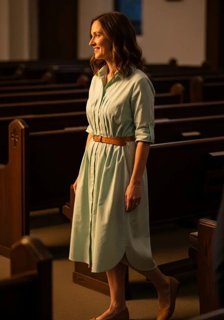 This look features a mint button front shirt dress with rolled sleeves and a clean pleated detail on the bodice. A tan belt brings structure to the waist while matching flats keep the outfit simple and polished. The soft cotton texture gives it a gentle church ready look.