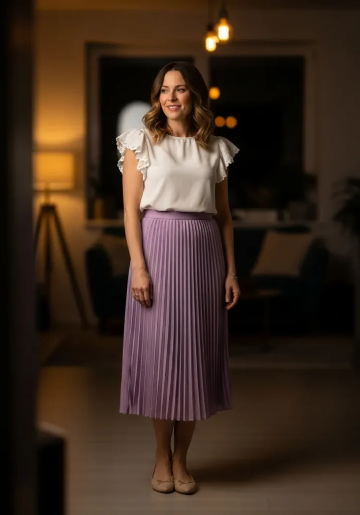 The look pairs a crisp white blouse with soft ruffled sleeves and a flowing lilac pleated skirt. The fabrics move nicely and feel elegant without being formal. Neutral flats keep everything sweet and classic. The color mix gives a soft spring glow that works in every church setting.