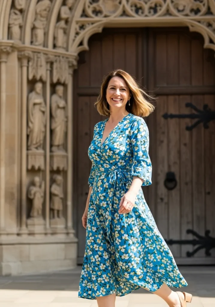 The look features a cheerful blue wrap dress covered in white and yellow blossoms. The wrap waist gives it shape and the midi length keeps it modest and breezy. Neutral sandals let the print shine and the golden light brings out the colors beautifully.