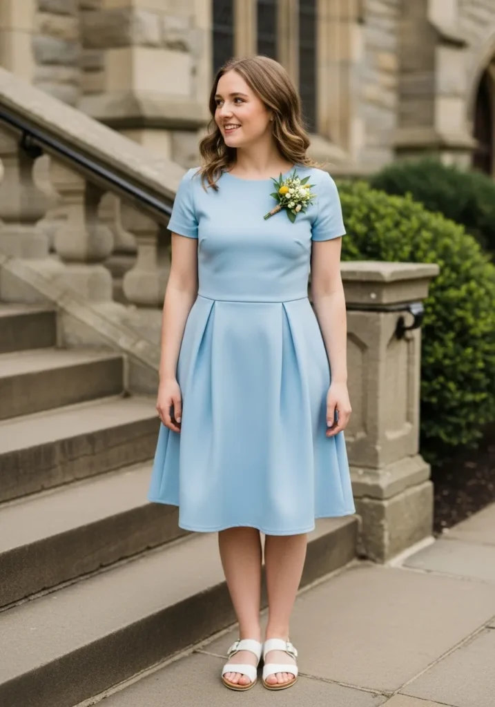 This style shows a clean sky blue A line dress with short sleeves and a soft structured fabric that holds its shape. The white sandals match the fresh and simple tone of the outfit. The look is sweet and modest with a soft spring accent added through the little floral pin.