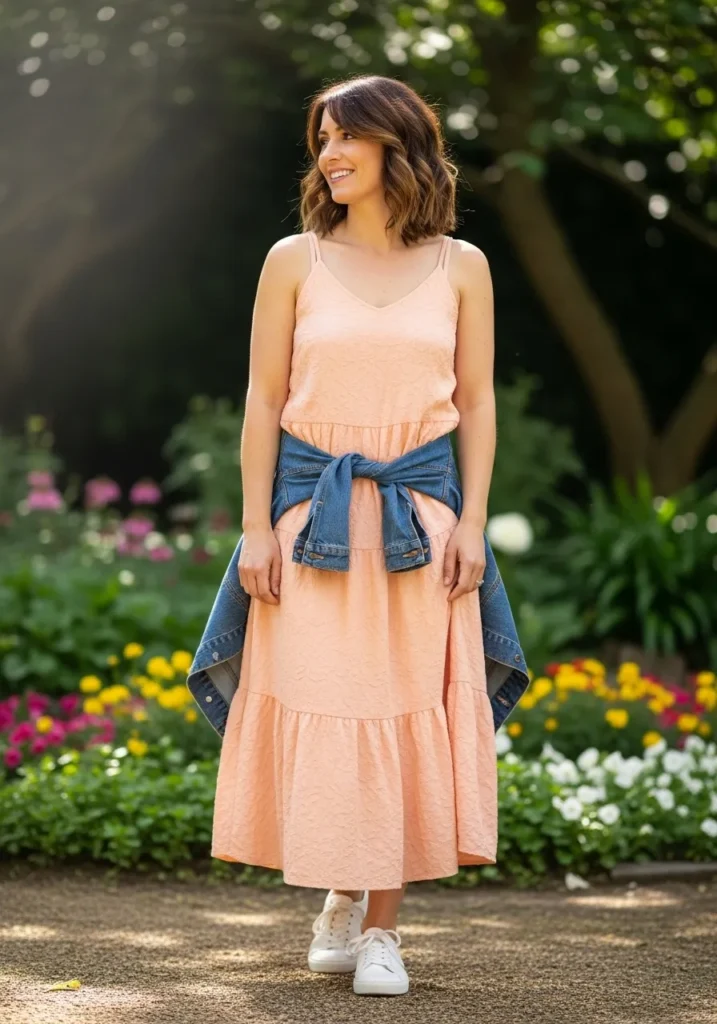 The outfit features a soft peach sundress with a breezy tiered skirt and thin straps that give it a sweet spring feel. A denim jacket is tied at the waist for a relaxed touch while white sneakers make the whole look playful and comfortable. The colors feel warm and sunny which fits beautifully with a garden setting.