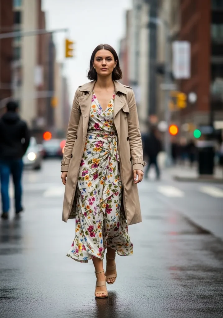 This outfit pairs a floral wrap dress full of bright blossoms with a beige trench coat that adds structure and polish. The dress moves gracefully while the coat tones the print down just enough to make it elegant. Neutral heeled sandals give the look height and balance.