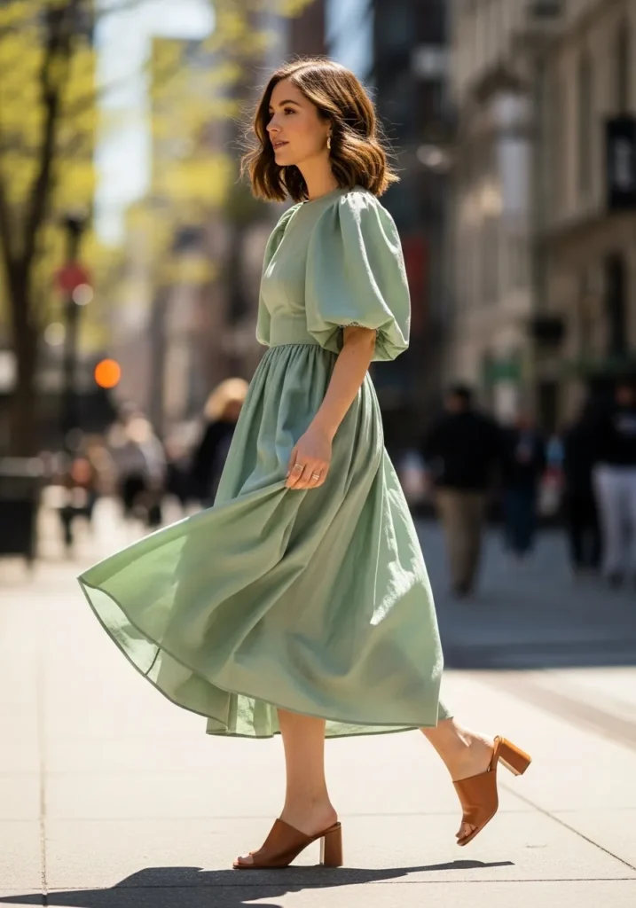 This sage green dress brings a soft airy feel with its puff sleeves and flowing skirt. The fabric catches light beautifully and the length feels perfect for church. The tan block heels add warmth and keep the outfit grounded in a subtle way.