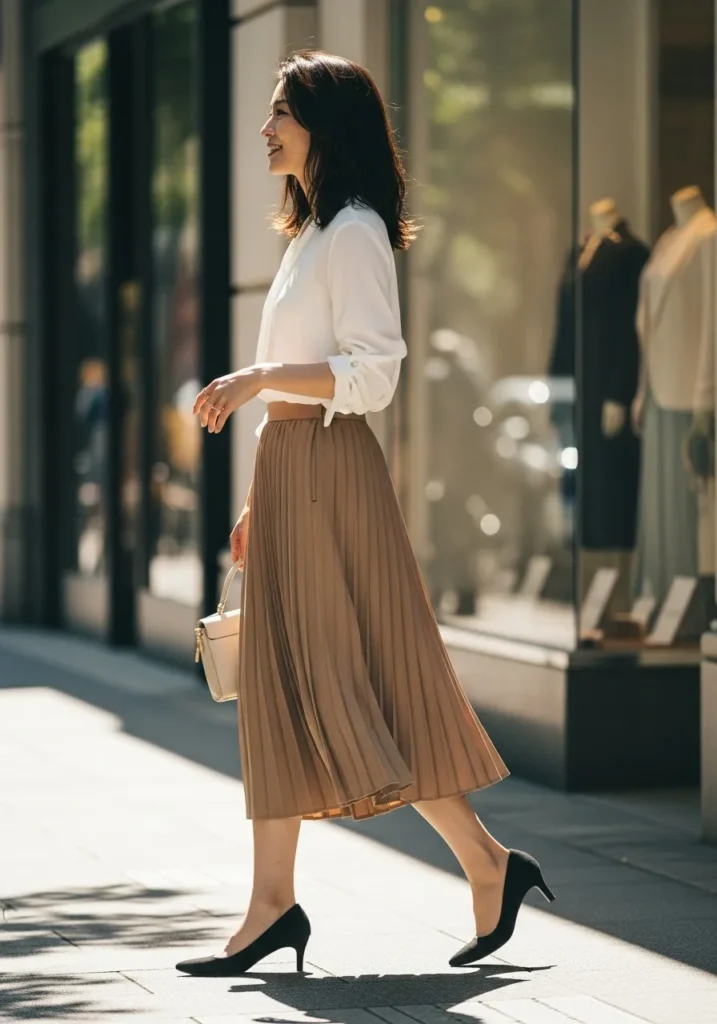 This outfit blends a crisp white blouse with a flowing tan pleated skirt creating a soft and elegant look. The pleats move beautifully and the black heels bring a subtle contrast. The small cream bag keeps things light and cohesive.