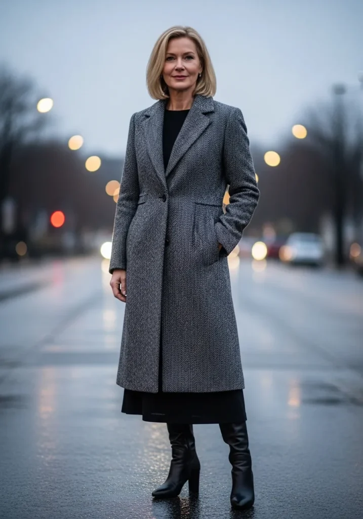 This outfit brings a refined winter feel with a long grey herringbone coat layered over a simple black dress. The coat adds beautiful structure and the black heeled boots give the look a sleek finish. The fabrics feel warm and classic and the muted tones make the whole outfit look polished even on a chilly day.
