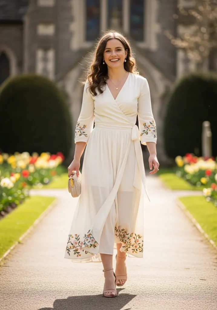 If you’re into pieces that feel feminine and uplifting this one is such a treat. I love how the embroidery gives it personality while the wrap style keeps things flattering. It is perfect for church on a bright day and always feels joyful to wear.