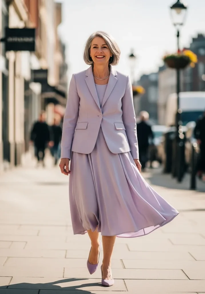 This look blends a tailored lilac blazer with a flowing midi skirt in the same dreamy shade. The matching top underneath keeps everything cohesive and the lilac heels finish the outfit beautifully. The fabric moves gently with each step and the soft color brings a light and uplifting feel.