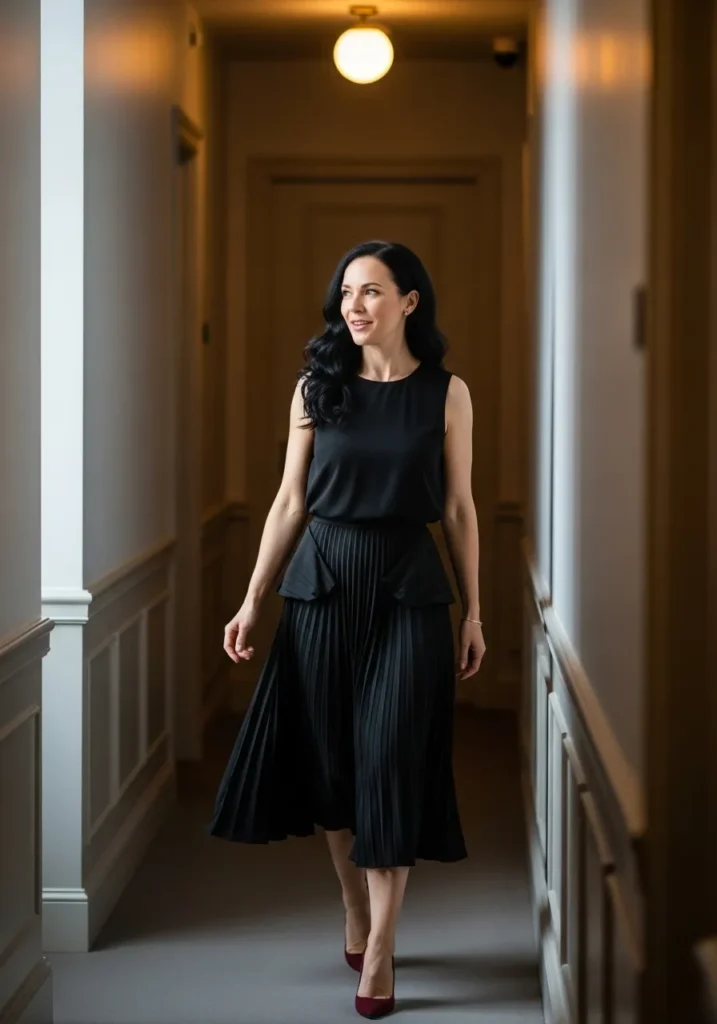 This outfit pairs a sleeveless black top with a long pleated black skirt that moves beautifully with each step. The textures create depth even without color and the burgundy heels add a rich pop that keeps the look from feeling flat. The overall vibe is elegant and modern with a hint of drama.