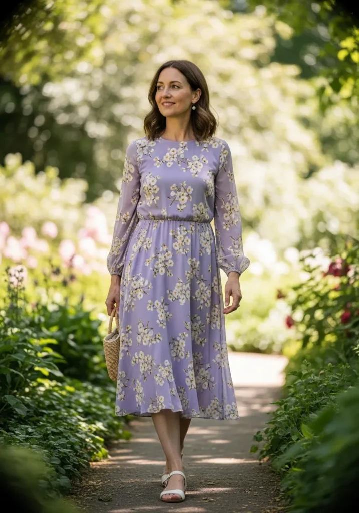 A lavender midi dress covered in delicate blossoms creates a light and floaty silhouette. The sheer sleeves add softness and the elastic waist keeps the shape comfortable. The pale tone feels gentle against garden greens which adds to the spring feeling.