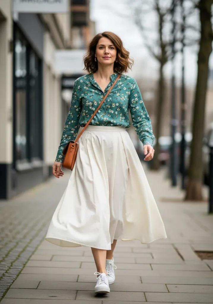 A teal floral blouse meets a full white midi skirt that sways with each step. White sneakers tone the outfit down in the cutest casual way while the brown crossbody bag adds a warm touch. The mix feels clean and fresh with just enough color.