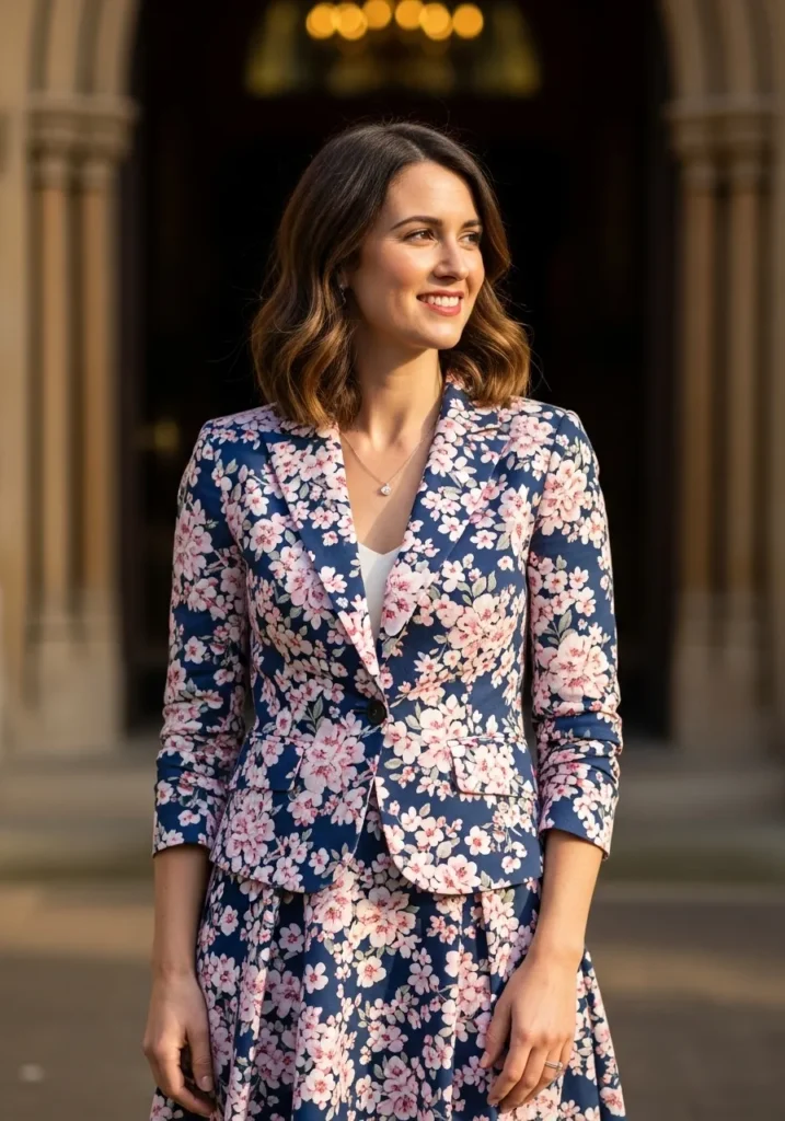 A tailored navy blazer covered in soft pink blossoms pairs with a matching skirt for a chic spring moment. The structured shape balances the playful print and the white top peeking underneath keeps everything bright. The whole outfit feels polished yet fun which is such a lovely mix for Sunday style.
