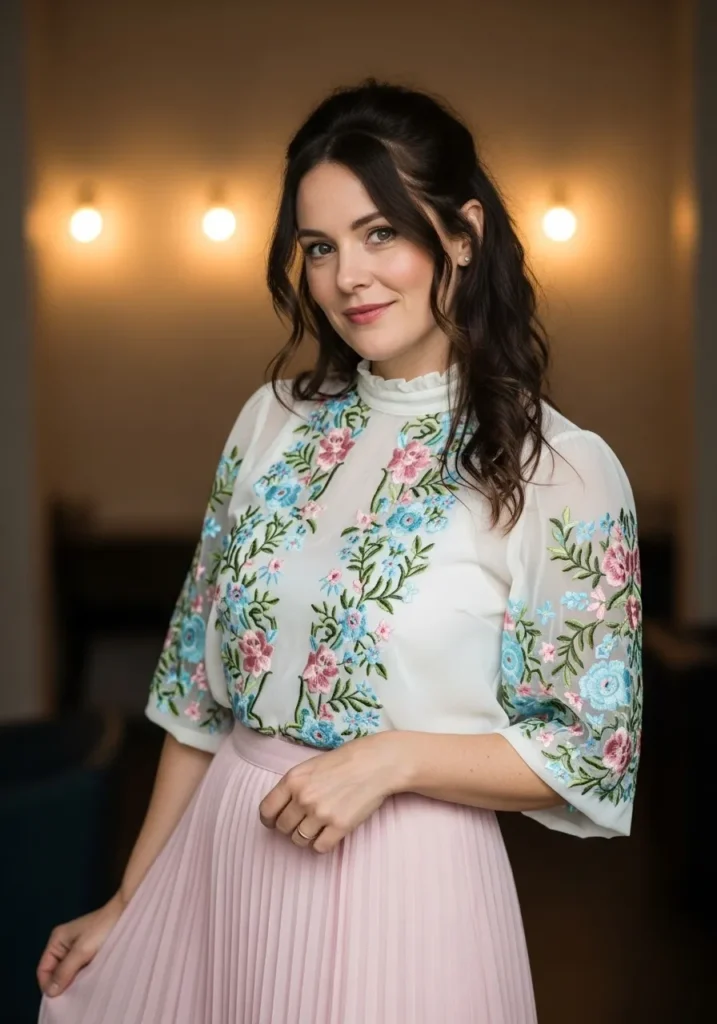 A white blouse covered in detailed embroidery pairs with a blush pleated skirt for a soft and romantic outfit. The textures are delicate and the pastel tones feel light. The blouse adds personality and the skirt gives the look gentle movement.