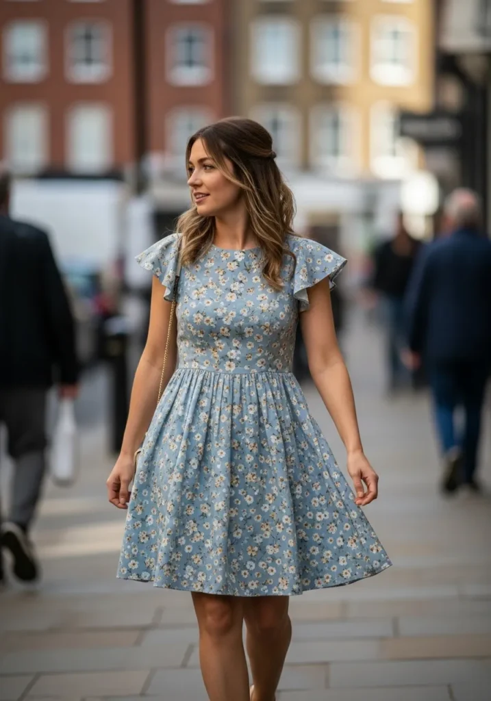 A blue fit and flare dress dotted with tiny blossoms feels youthful and sweet. The flutter sleeves add movement and the soft fabric keeps the shape light. The floral print stays subtle which makes it perfect for a relaxed spring morning.