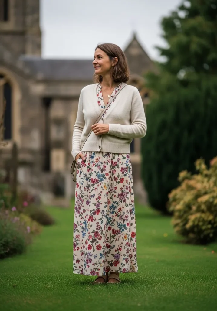A long cream cardigan adds cozy warmth over a flowy floral maxi dress in muted colors. The soft knit creates gentle contrast against the printed fabric and the crossbody bag keeps the outfit practical. The whole look feels grounded and comfortable.