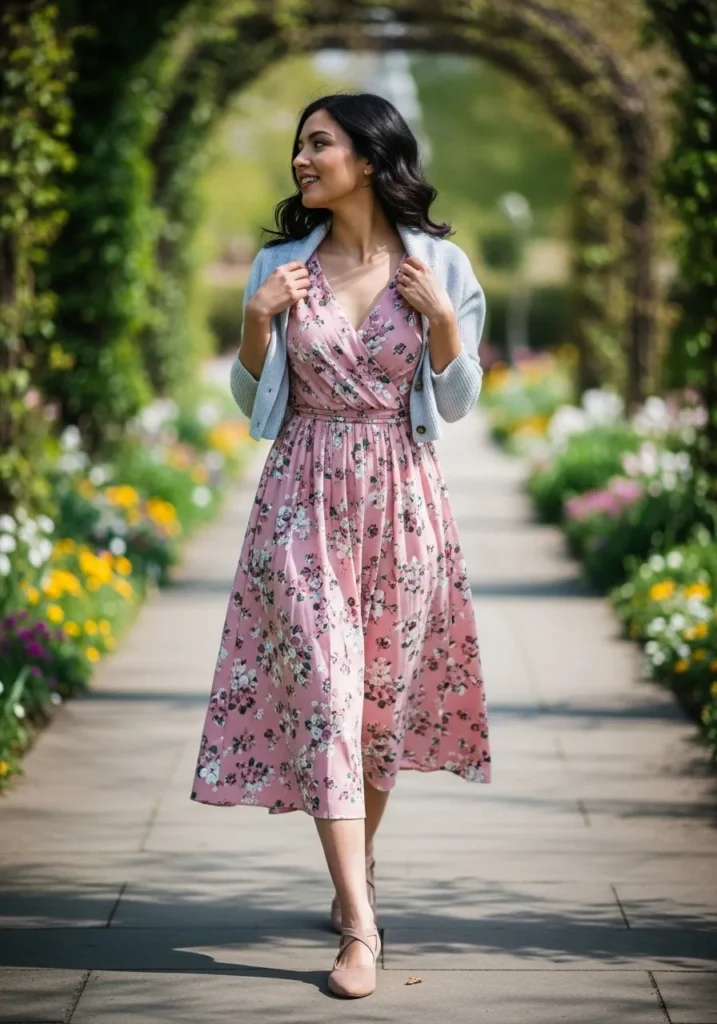 A pink wrap dress with scattered blossoms looks fresh under a soft blue cardigan. The skirt moves with every step and the delicate floral print gives the dress a romantic tone. Neutral flats finish the outfit without pulling attention.