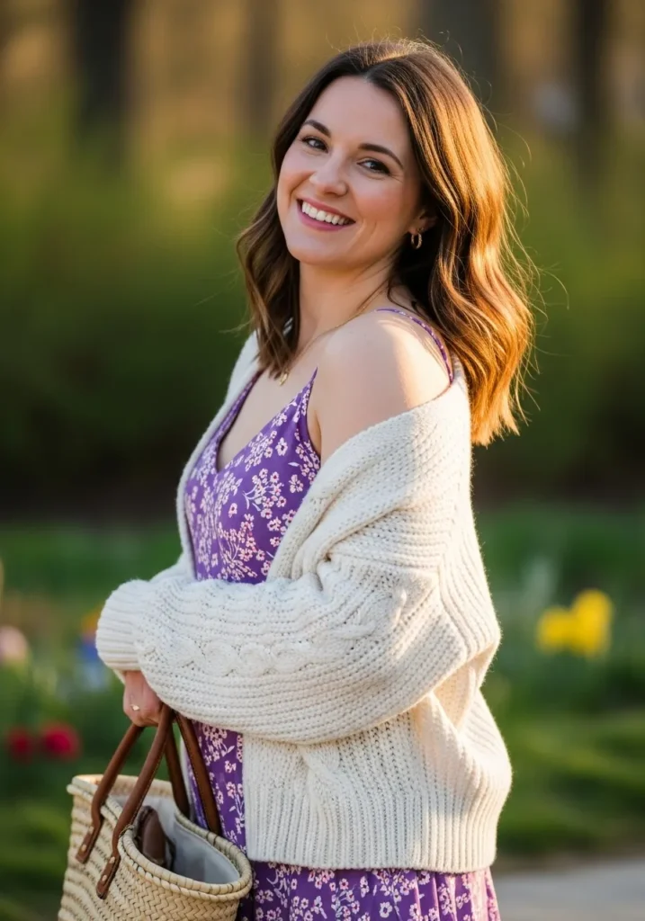 A purple sundress with tiny blooms brings bright spring energy and the chunky cream cardigan adds warmth and texture. The mix of light fabric and knit softness creates a sweet everyday look that still feels polished.