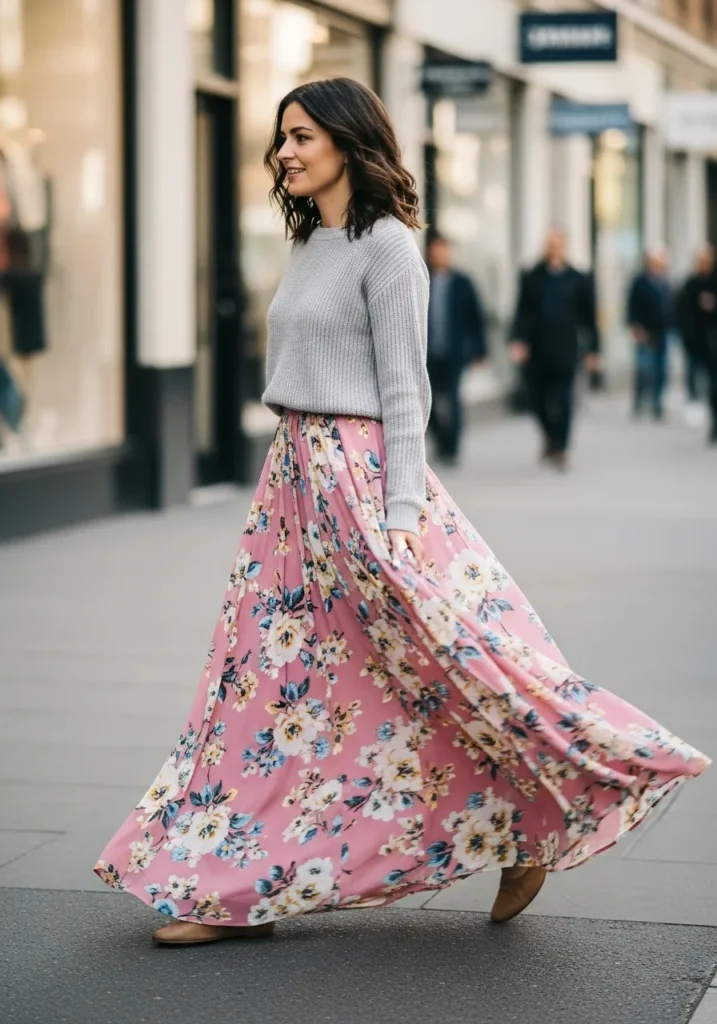 A cozy grey knit sits softly against a flowing pink floral skirt that moves with every step. The contrast of texture and color makes the outfit feel relaxed yet feminine. Neutral shoes let the skirt shine and the whole look feels comfortable for a long service.