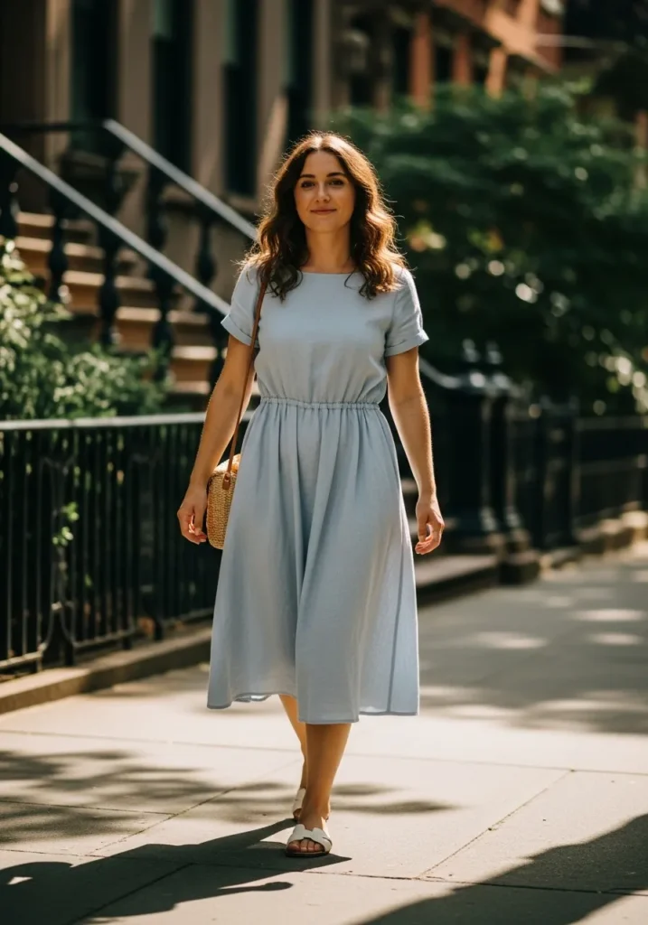 This look brings a sweet light blue dress with a simple gathered waist that creates a gentle shape. The fabric looks airy and smooth which makes it perfect for warm weather. White sandals and a woven crossbody bag keep things simple and summery.