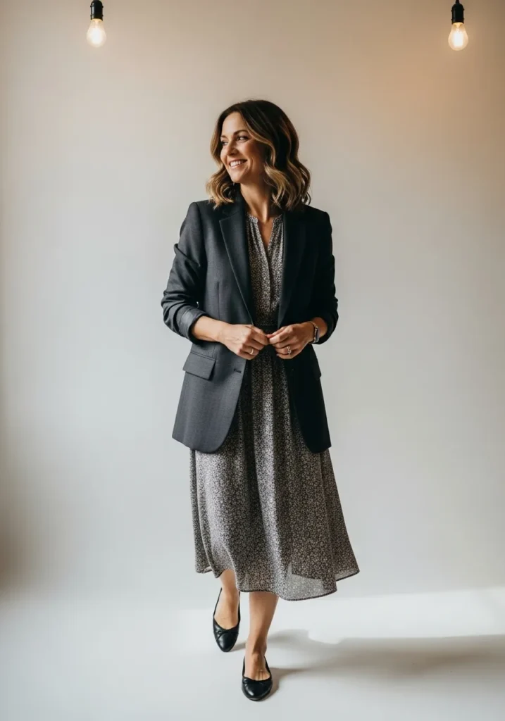 A tiny floral print dress adds a soft pattern while the charcoal blazer brings a polished layer on top. The contrast looks balanced and thoughtful and black flats keep the look clean. The mix of textures gives the whole outfit a lovely bit of depth.