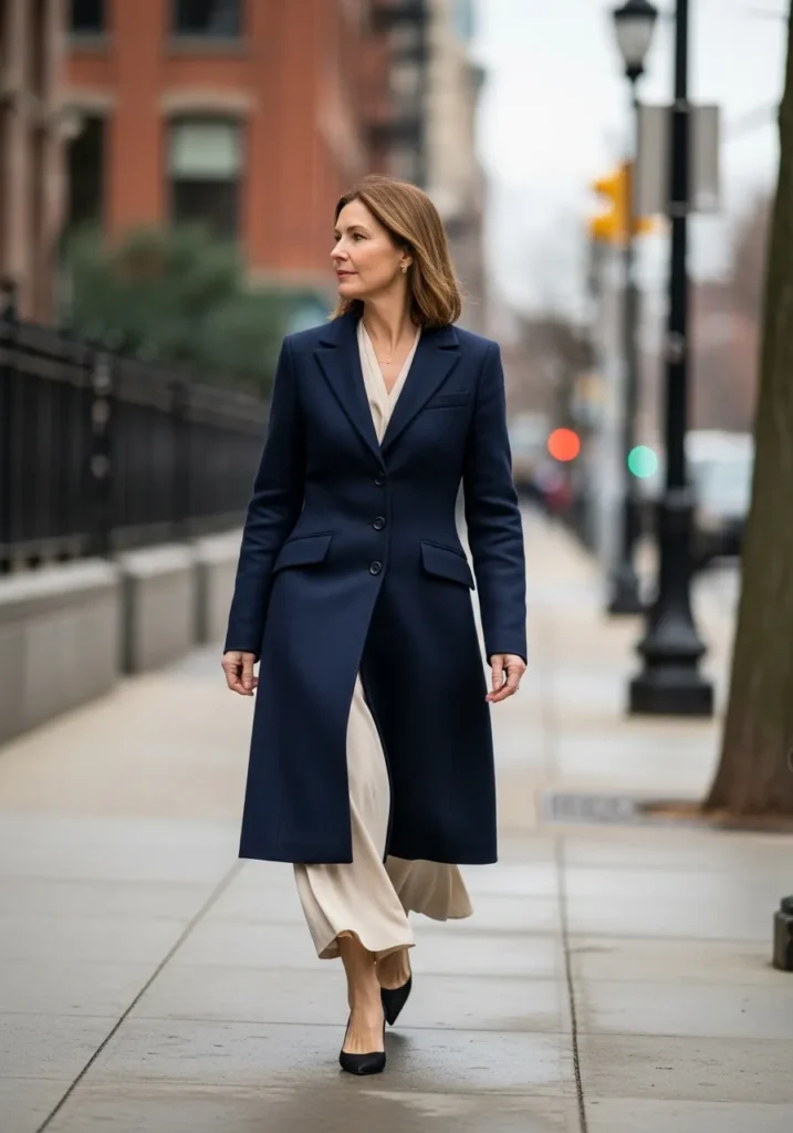 This look layers a long navy coat over a flowing cream dress that moves with such a pretty sweep. The structured coat gives the outfit a graceful shape while the dress keeps everything gentle underneath. Black heels finish the look with quiet polish that matches the simple color story.