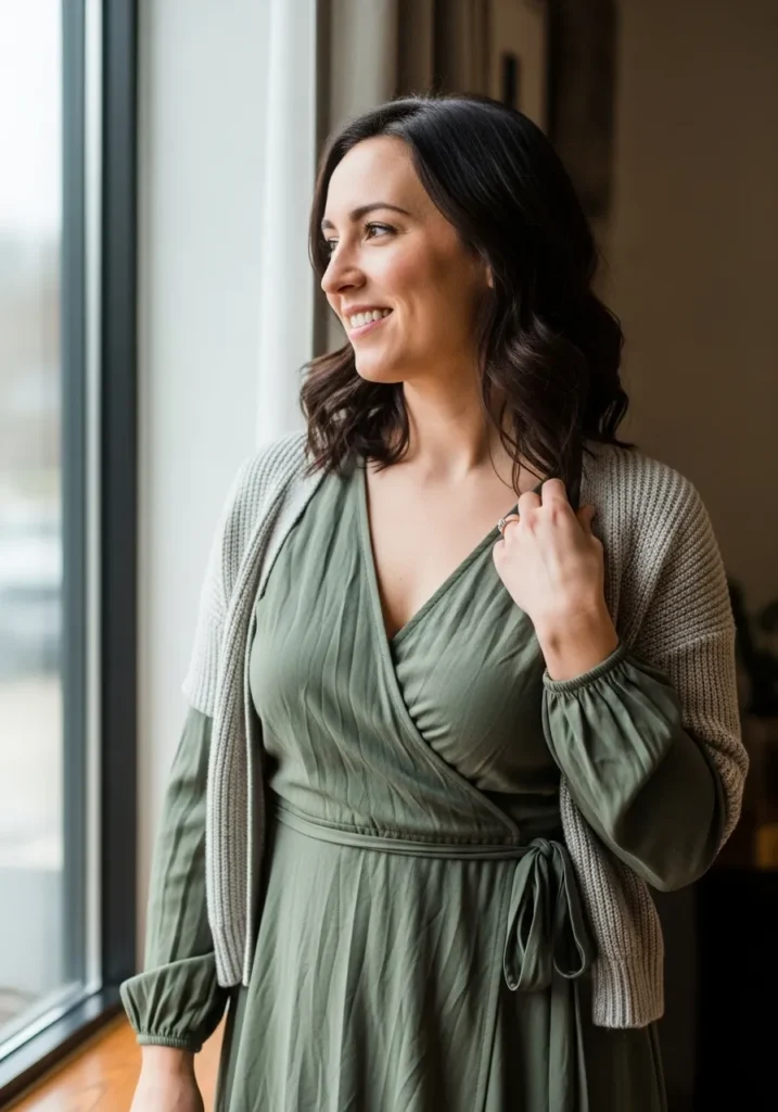 A light sage wrap dress creates a lovely feminine shape while the knit cardigan adds an easy layer of comfort. The colors stay calm and earthy which gives the whole outfit a soft presence. The relaxed fit makes it feel effortless and sweet.