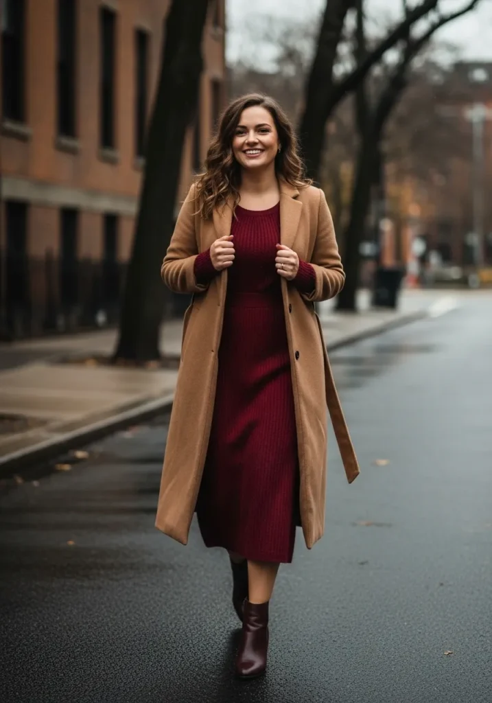 A ribbed burgundy dress sets the tone here with a cozy feel and a flattering fit that stays modest. The long camel coat adds warmth and structure which creates a pretty mix of soft texture and classic tailoring. Matching ankle boots tie the colors together for an easy fall or winter look.