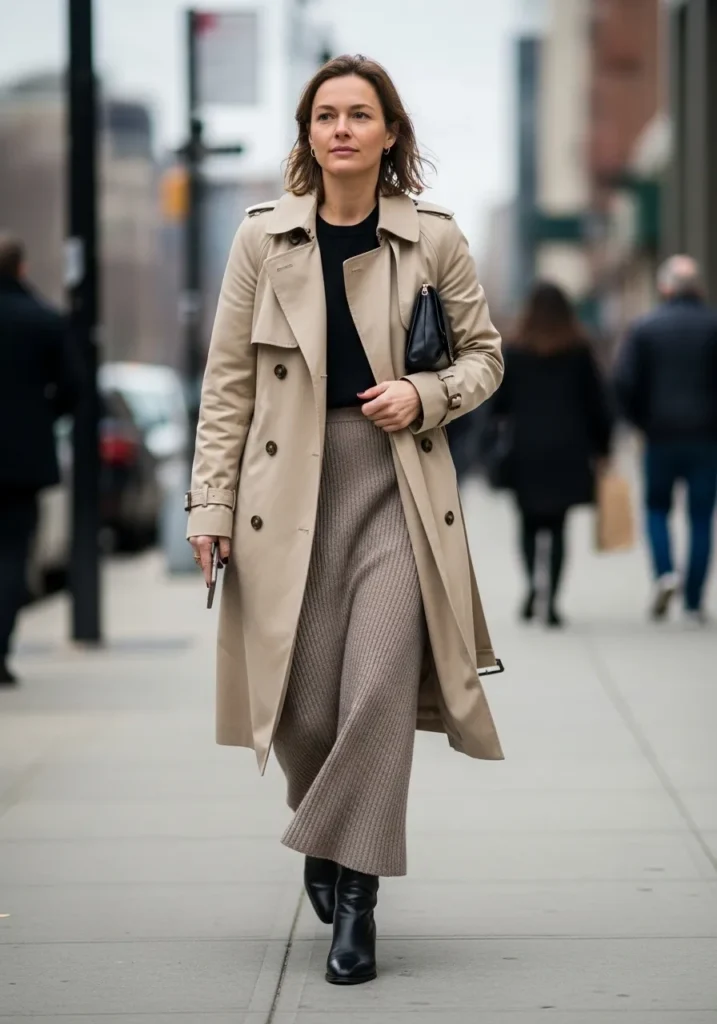 I love how easy this feels while still looking smart. The knit pants add comfort and the trench brings that timeless charm I always appreciate. It is modest warm and great for brisk mornings.