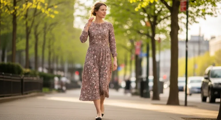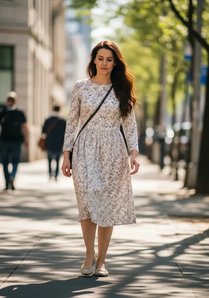 A light floral dress creates a soft silhouette with its long sleeves and gathered waist. The muted print keeps things gentle and the simple neutral flats finish the outfit without any fuss. The whole look feels calm and ladylike.