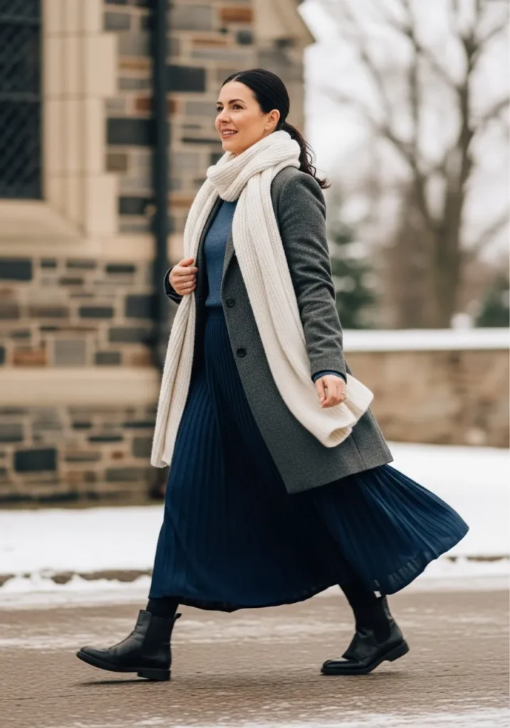 Here we have a charcoal coat layered over a blue knit top and a long pleated skirt in a matching shade. A chunky ivory scarf wraps around the neck which adds both warmth and softness. Black ankle boots complete the outfit with sturdy winter comfort.