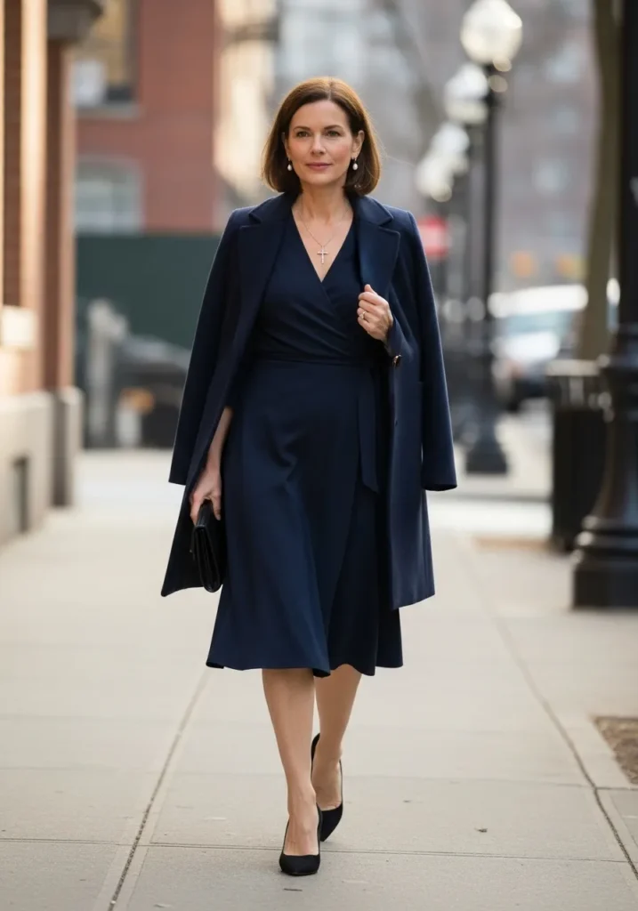 A navy wrap dress creates a smooth and flattering shape and sits at a modest knee length. A matching coat rests over the shoulders adding a structured layer in the same deep tone. Classic black heels and a small clutch keep the outfit refined and serene.