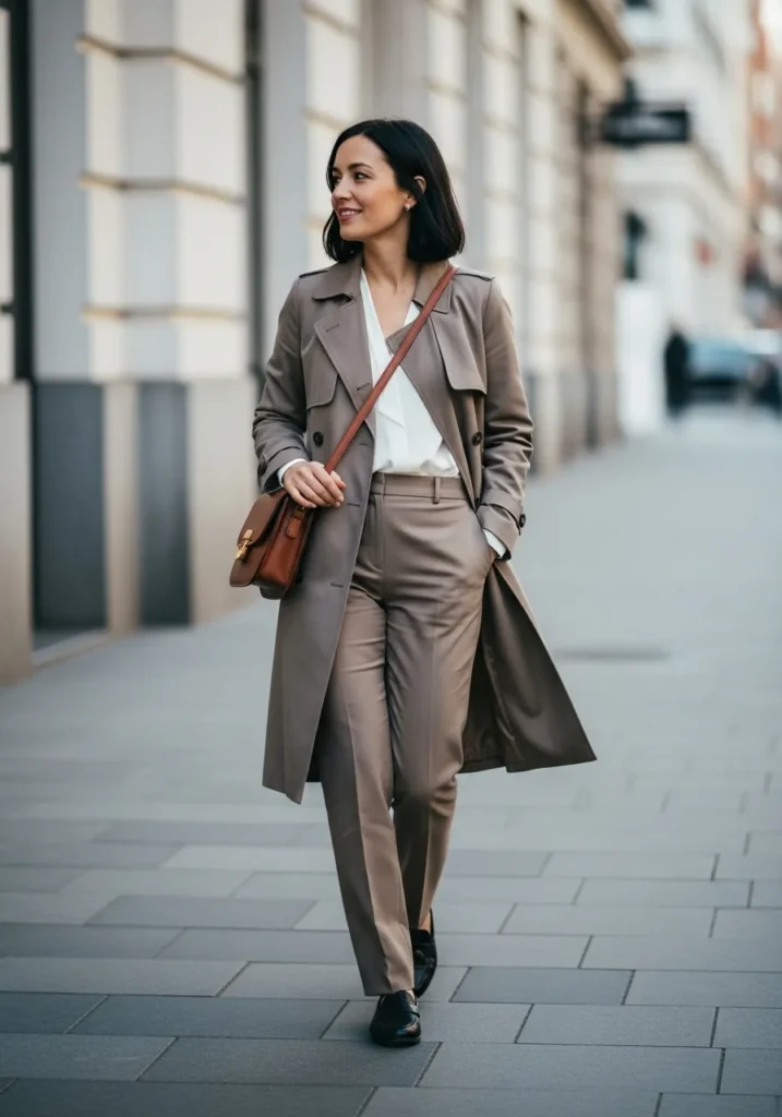 This outfit pairs a light taupe trench with matching tailored trousers and a crisp white blouse. The fabrics feel smooth and structured, giving the whole look a polished mood without feeling stiff. The crossbody bag adds a warm accent that blends well with the muted palette. The shoes keep everything sleek and classic, so the look stays refined from top to bottom.