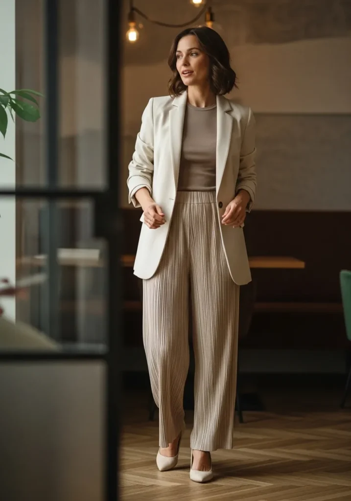 This look layers a cream blazer over a taupe top and pairs it with wide pleated trousers in a matching tone. The fabrics feel soft and lightweight giving everything a smooth and elegant finish. The neutral heels tie the whole palette together in the most seamless way.