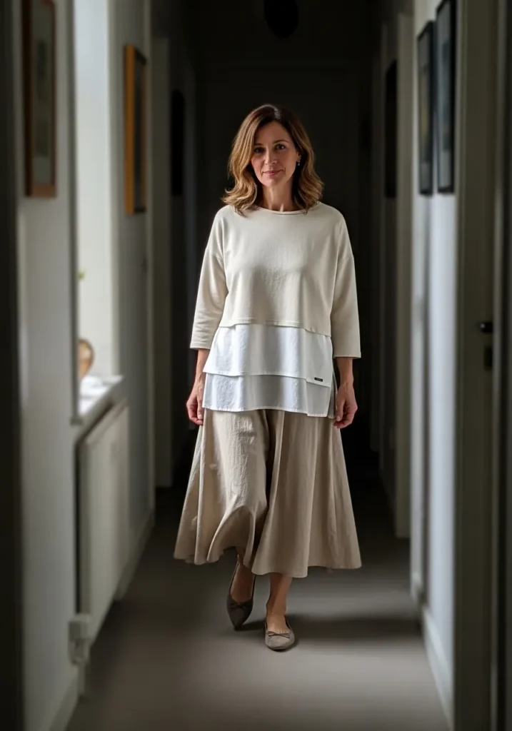 This look features a layered cream top with soft tiered panels paired with wide beige trousers that flow with each step. The fabrics feel light and airy giving the outfit a gentle and relaxed mood. The taupe flats keep the palette cohesive and comfortable.