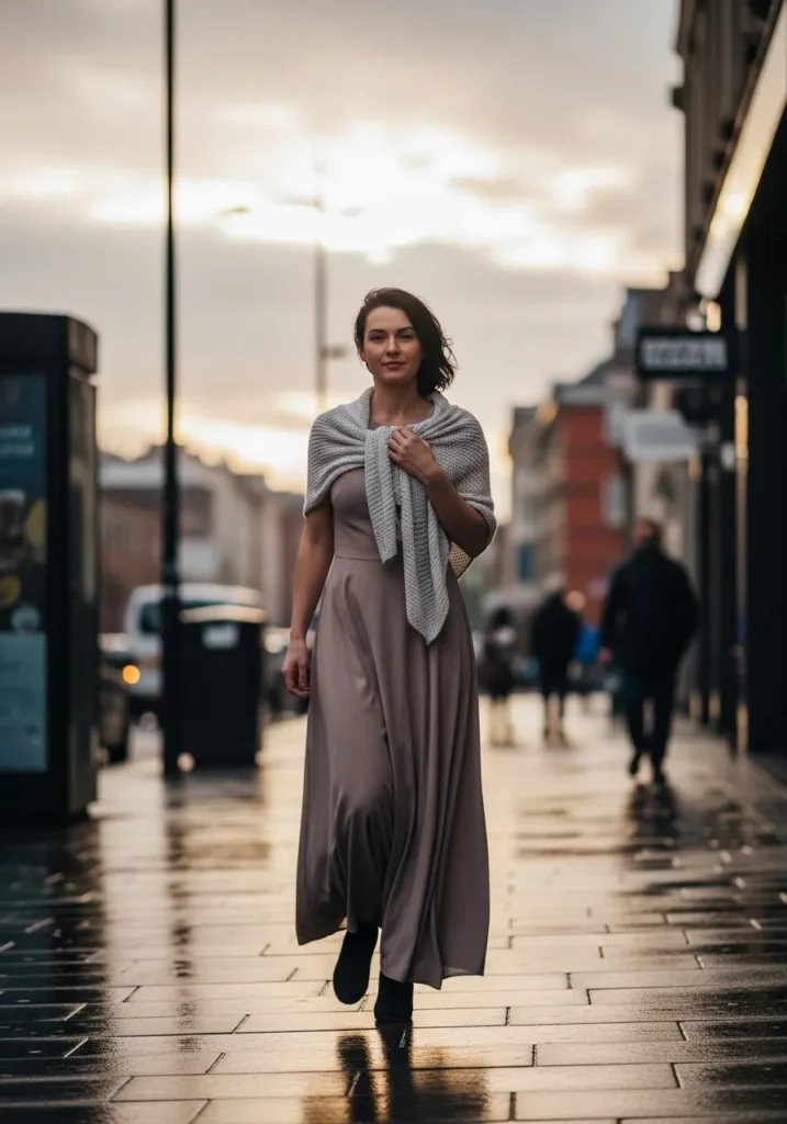 This look brings together a taupe maxi dress with a light grey knit draped casually over the shoulders. The dress moves beautifully with each step and the wrap adds warmth without weighing anything down. The darker boots ground the outfit and keep the palette soft and neutral.