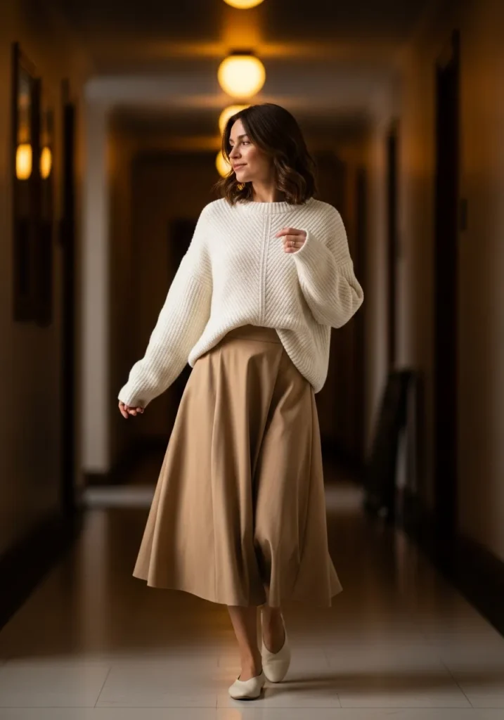 This look brings together an oversized white knit sweater and a soft camel midi skirt that moves with each step. The textures stay cozy and calm while the simple cream flats keep everything light. The silhouette feels relaxed but still intentional.