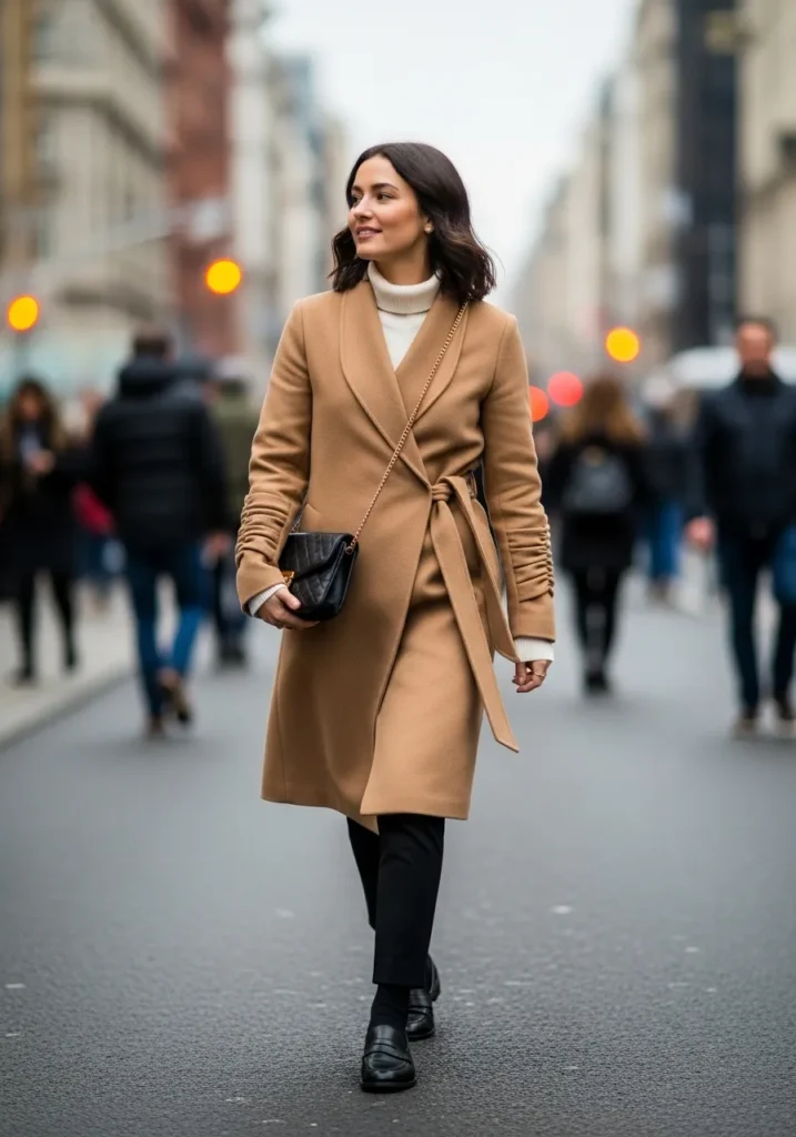 This look layers a chic camel wrap coat over a cream turtleneck and black trousers. The coat adds a warm and elegant touch, while the simple black loafers keep things grounded and comfortable. The small black bag ties in with the darker tones, giving the outfit a clean and cohesive finish.
