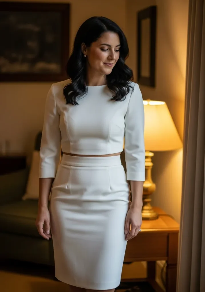 A fitted white top with three quarter sleeves matches a sleek pencil skirt in the same crisp fabric. The clean lines give this set a modern and polished feel. The subtle cropped cut adds a touch of interest while keeping everything modest and graceful.