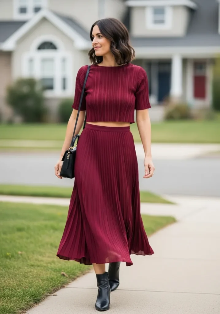 A ribbed burgundy crop top pairs with a matching pleated midi skirt for a rich and romantic look. The fabric has a soft sheen that catches the light as the skirt moves. The deep tone keeps the set feeling elegant while the pleats add beautiful flow.