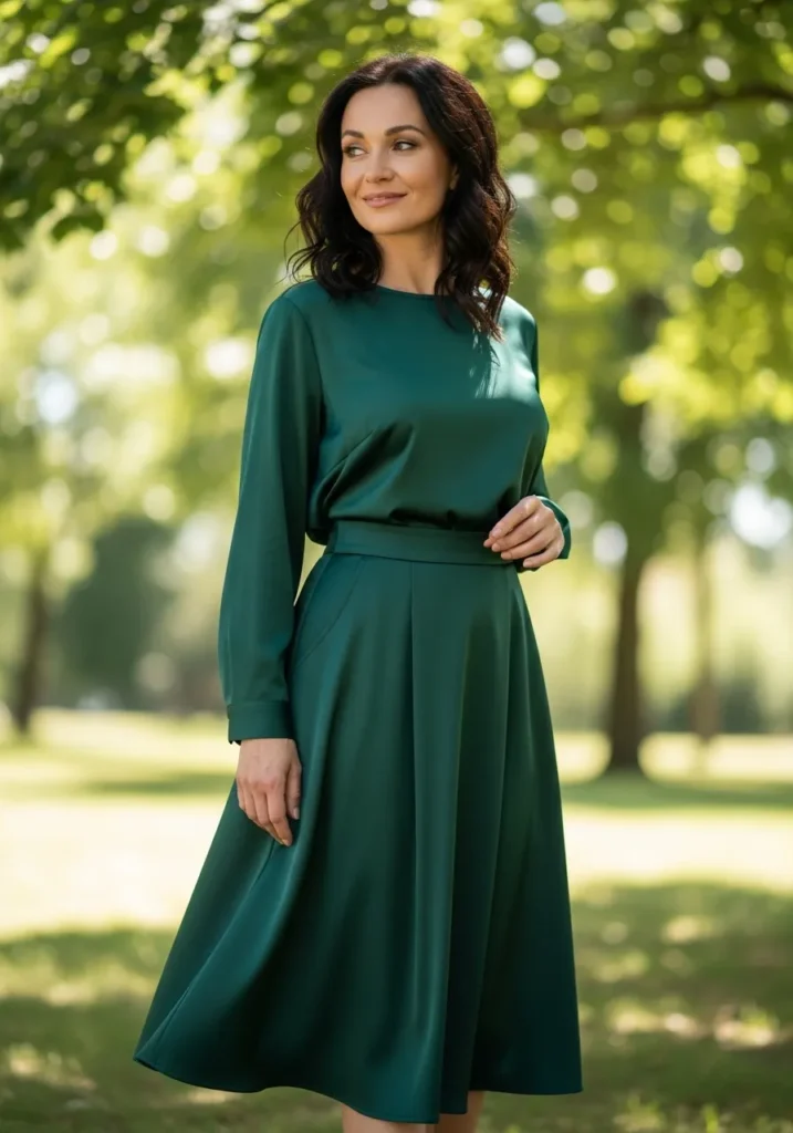 A smooth emerald top sits neatly above a matching A line skirt that creates beautiful movement. The satin inspired fabric gives the outfit a gentle shine while the rich green shade feels vibrant and elegant. The long sleeves add a modest and polished touch.