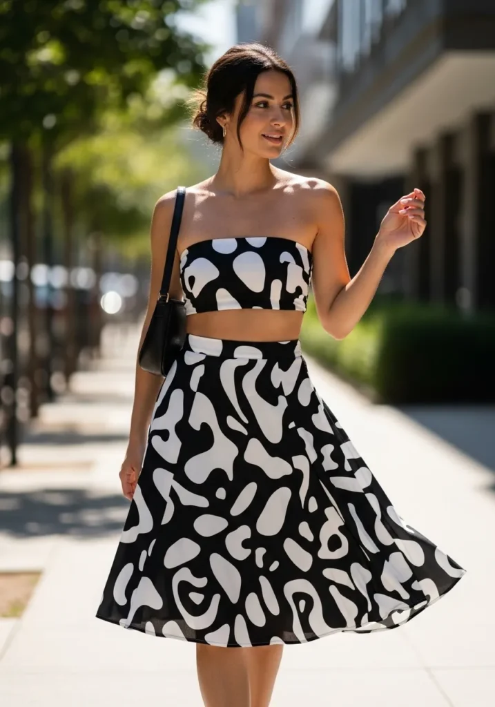 A bold black and white strapless top pairs with a matching flowy skirt covered in a fun abstract print. The fabric moves beautifully with every step and the pattern keeps the whole outfit lively without feeling busy. The strapless cut brings a modern touch while the midi length skirt adds a soft, breezy balance.