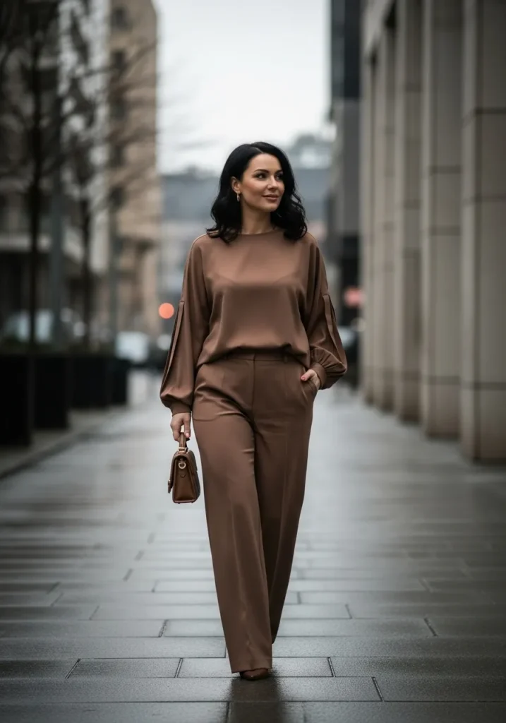 A silky mocha top with soft balloon sleeves pairs with matching wide leg trousers for a relaxed yet elegant look. The smooth fabric gives the outfit a subtle sheen while the warm brown tone feels rich and timeless. The sleeves add a touch of drama in the softest way.