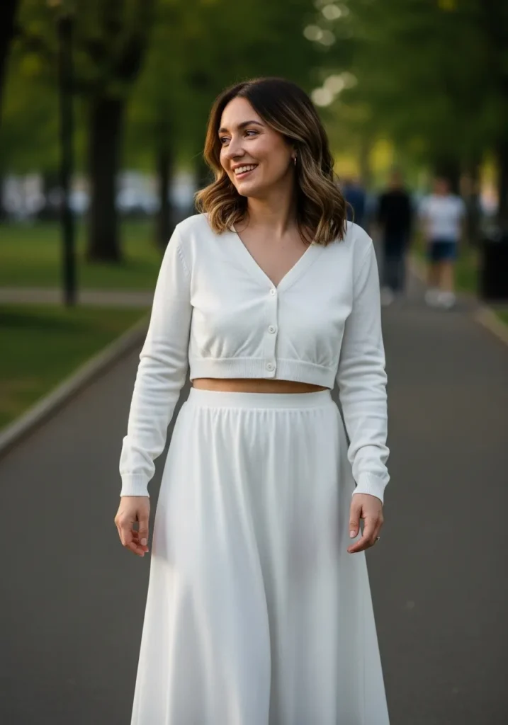A cropped white cardigan meets a matching soft flowing skirt for a charming and feminine look. The knit top adds a cozy texture while the skirt keeps the outfit light and breezy. The all white color palette makes the whole set feel fresh and clean.