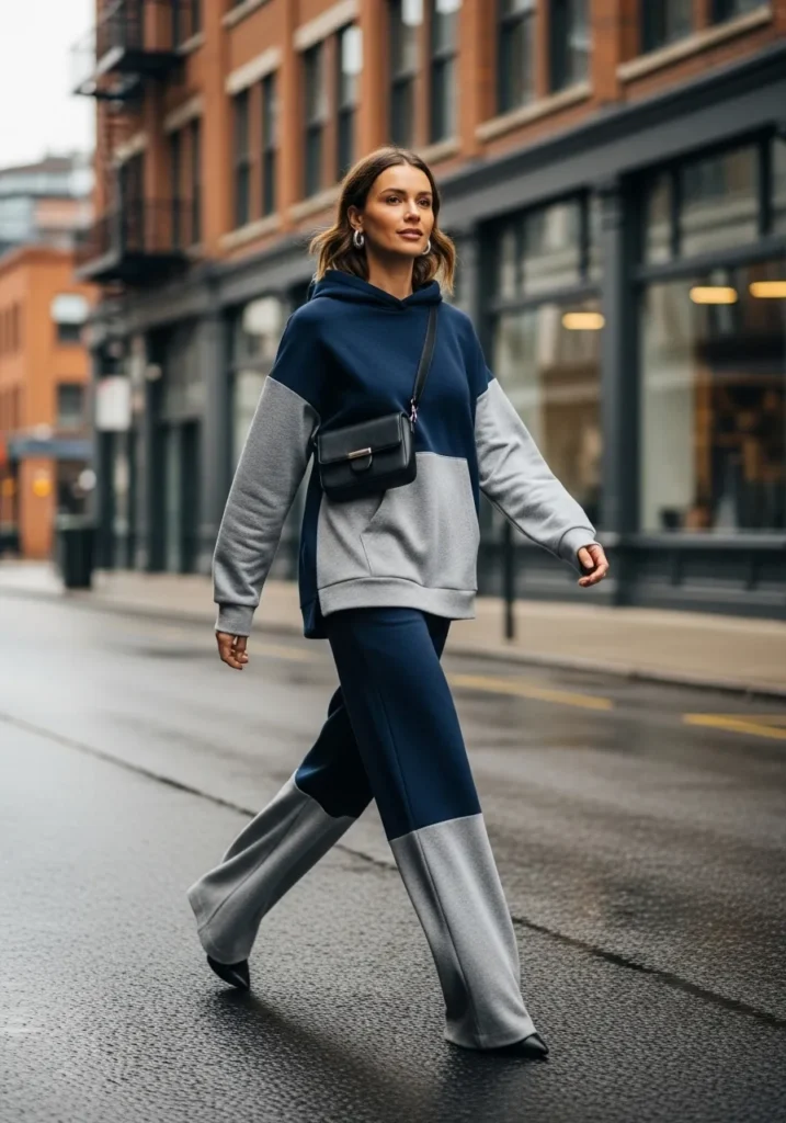 A navy and grey color block hoodie pairs with matching wide leg pants for the most relaxed two piece moment. The soft sweatshirt fabric keeps things cozy while the color blocking adds a stylish twist. The loose fit gives the outfit an easygoing laid back vibe.