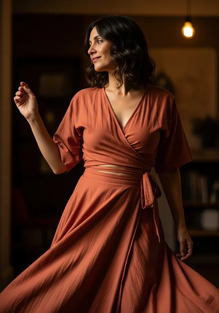 A warm terracotta wrap top pairs with a matching flowing skirt in the same soft fabric. The wrap detail flatters the waist beautifully while the skirt adds graceful movement. The earthy color brings a cozy and inviting mood to the look.
