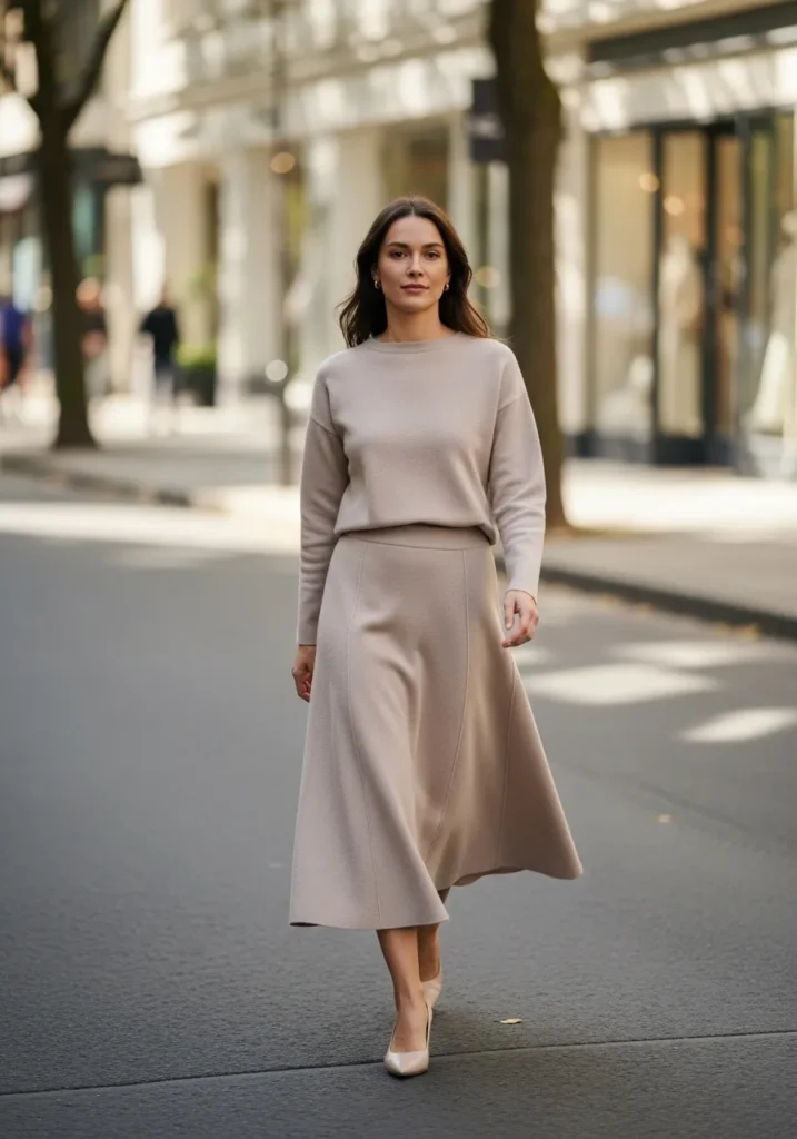 A smooth taupe sweater pairs with a matching midi skirt in a soft knit that drapes beautifully. The neutral shade keeps the outfit calm and timeless while the clean silhouette adds an elegant touch. The skirt’s gentle flow creates such a flattering shape.