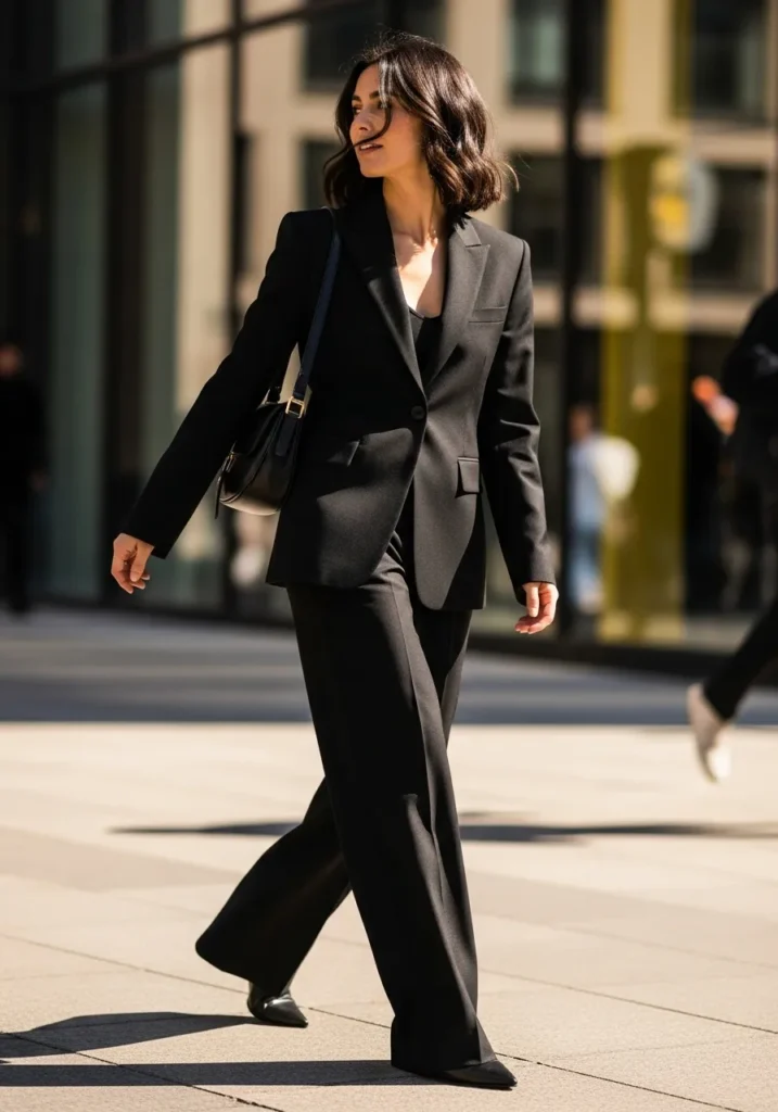A tailored black blazer sits over relaxed matching trousers for a timeless two piece moment. The fabric has a smooth finish that keeps the outfit structured while the shape stays flattering. Simple accessories let the suit lead the look with confidence.