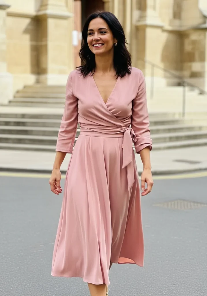 A blush wrap top brings a soft sheen and pairs with a matching flowing bottom that moves with each step. The gentle pink tone feels warm and romantic while the fit stays flattering around the waist. The silky finish adds a bit of shine without going too bold.