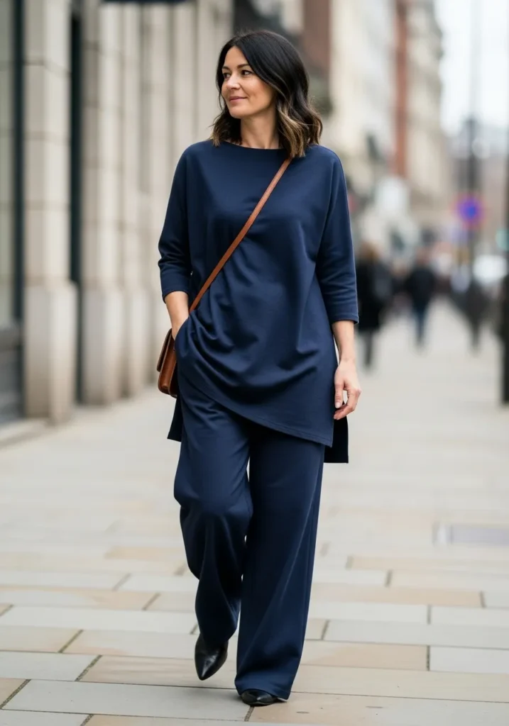 This kind of outfit makes busy mornings easier. I enjoy how forgiving the fit feels while still looking intentional. Navy always brings that quiet elegance that works in so many settings.