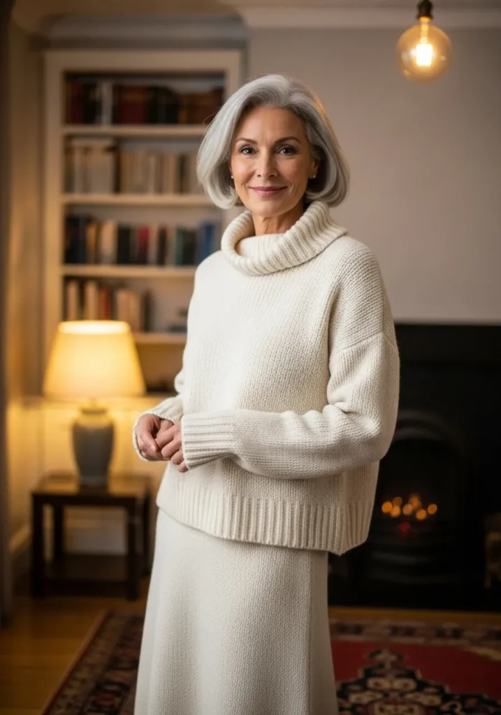 A soft cream turtleneck sweater meets a matching knit skirt for a warm and graceful outfit. The texture adds gentle depth while the simple shape keeps everything elegant. The neutral shade feels calm and timeless.