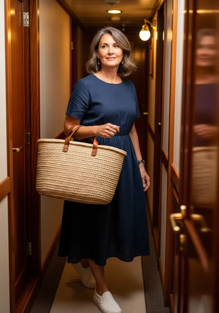 I love how this kind of outfit makes packing feel simple. A dress like this works for walking the ship, grabbing lunch, or heading to the pool deck. It feels polished without trying too hard, and the tote gives enough room for sunscreen and all the little things I somehow always end up carrying.